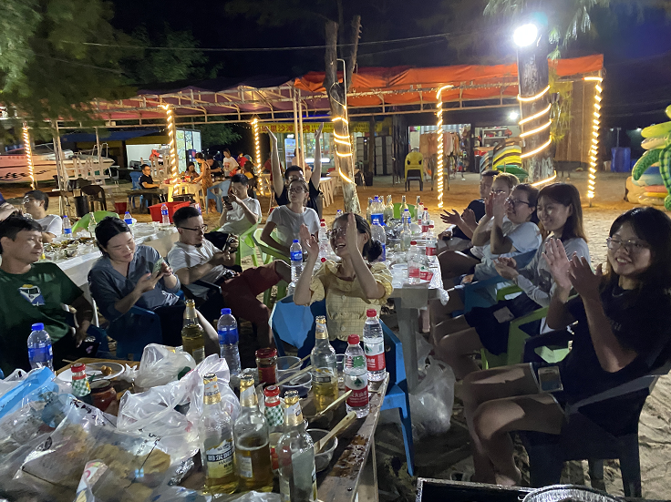養(yǎng)足了精神,帶上準備好的食材大家來到了海邊,開始搬桌子、擺椅子、搭爐子, 開始海邊燒烤,男女搭配干活不累,大家分工合作,不一會兒,香噴噴的味道就迎著海風(fēng)撲面而來,我們看海上升明月,對酒當歌!